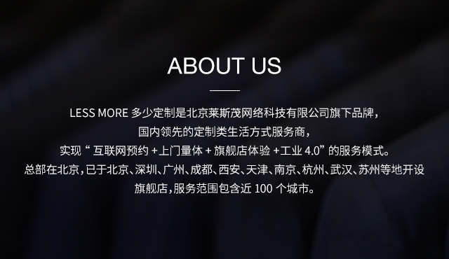 LESS MORE多少定制 2015年5月創(chuàng)立于北京,以互聯(lián)網(wǎng)思維和工業(yè)4.0切入服裝定制領(lǐng)域,獨(dú)創(chuàng)“互聯(lián)網(wǎng)預(yù)約+旗艦店體驗(yàn)+免費(fèi)上門(mén)量體+工業(yè)4.0 C2M生產(chǎn)”的模式,現(xiàn)已成為國(guó)內(nèi)服裝定制行業(yè)的標(biāo)桿品牌。